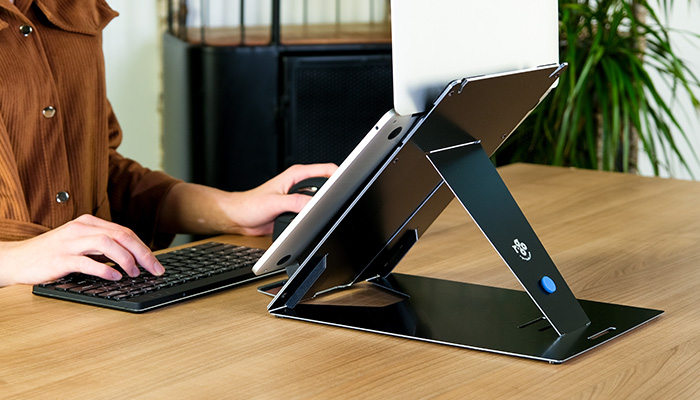 Met de R-Go Riser Duo laptop- en tabletstandaard kun je zowel je laptop als je tablet verhogen. De standaard is eenvoudig in 4 standen verstelbaar, zodat je altijd op ooghoogte kunt werken. Dit brengt je hoofd in een natuurlijke stand en vermindert de spanning in je nek- en schouderspieren. De R-Go Riser Duo is ultradun en lichtgewicht: ideaal om mee te nemen in je tas!
