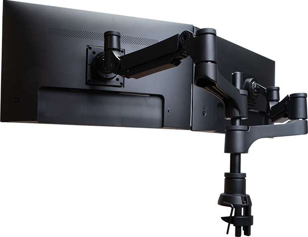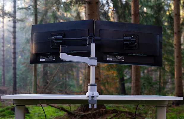 R-Go Caparo dubbele monitorarm, volledig instelbaar met gasveer, 100% circulair, zwart.